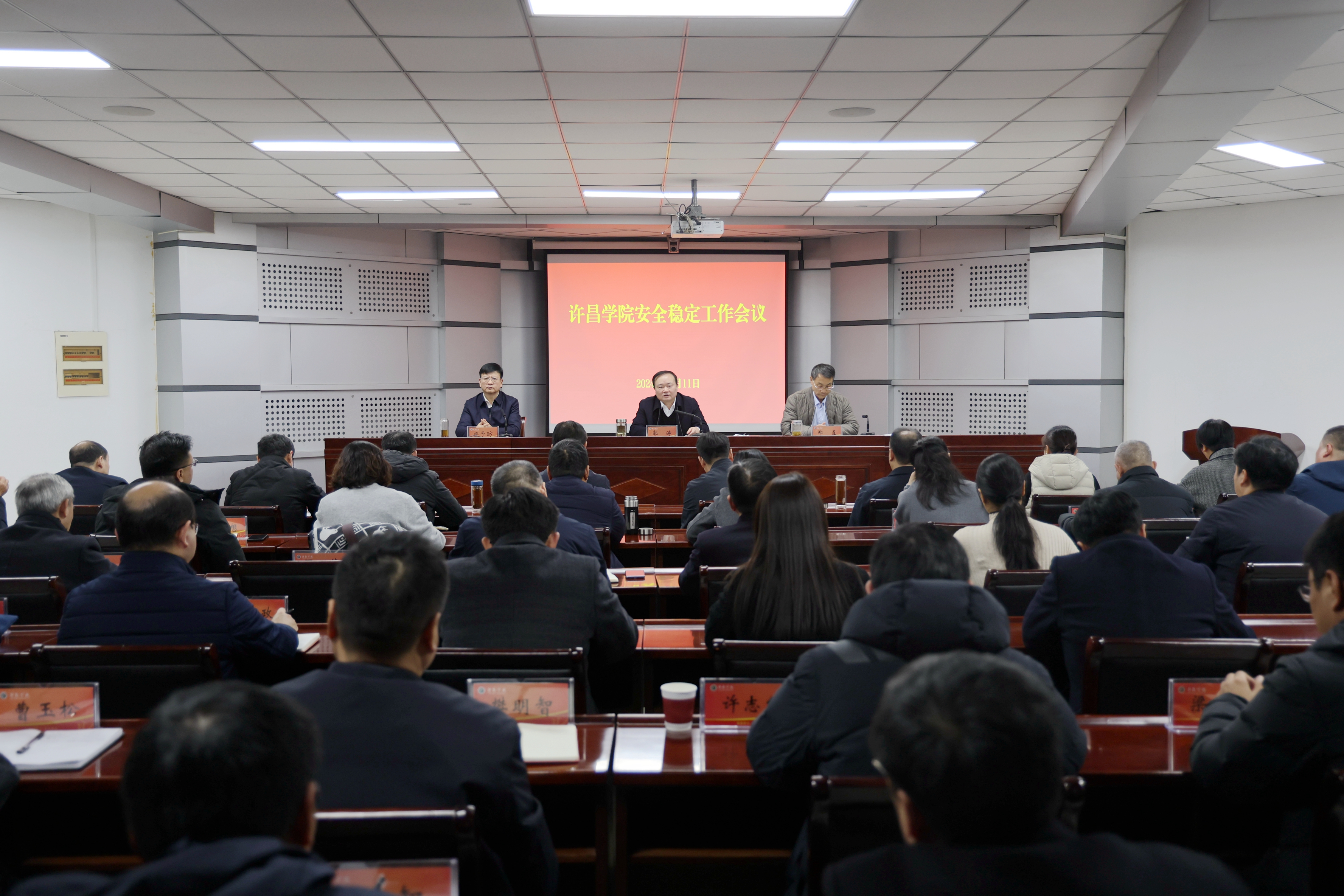 会上,郭涛就做好当前和今后一个时期学校的安全稳定工作进行强调部署,提出明确要求。他指出,一年来,在上级部门的正确领导和许昌市属地的大力支持下,在全校上下的协同联动、共同努力下,学校安全稳定工作总体上平稳有序,为学校事业发展营造了安全稳定的校园环境,提供了有力的安全保障。他强调,年终岁尾是安全稳定事故的易发、多发期,做好校园安全稳定工作责任重大,必须要时刻绷紧安全稳定“思想弦”。一要提高政治站位,充分认识抓好安全稳定工作的重要性和必要性。二要持续深入开展风险隐患排查整治,切实筑牢校园安全屏障。三要大力加强师生安全教育,严格落实各项安全管理制度机制。四要强化责任担当,进一步压紧压实工作责任。全校各单位要深入学习贯彻习近平总书记关于安全工作的重要指示批示精神和上级部署要求,进一步强化风险意识和底线思维,守土有责、守土负责、守土尽责,全力以赴做好安全稳定工作,持续为学校事业高质量发展营造安全稳定的校园环境。